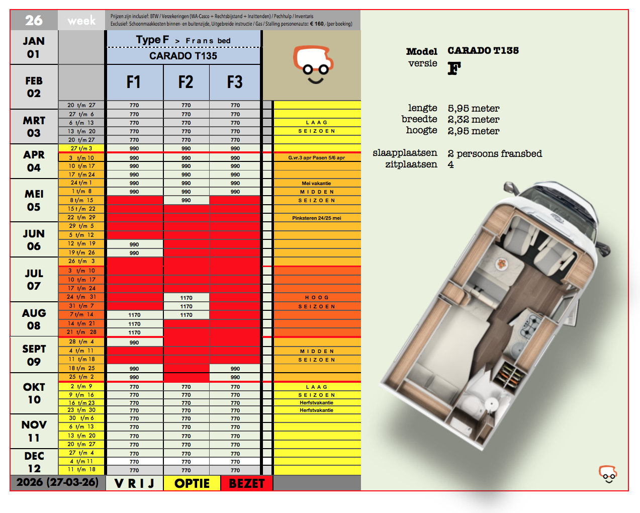 De camper staat op een breedspoor chassis en heeft dankzij een grote garage de mogelijkheid om fietsen onder het bed plaats te laten vinden, waardoor het totaal toch nog binnen de 7 meter blijft.